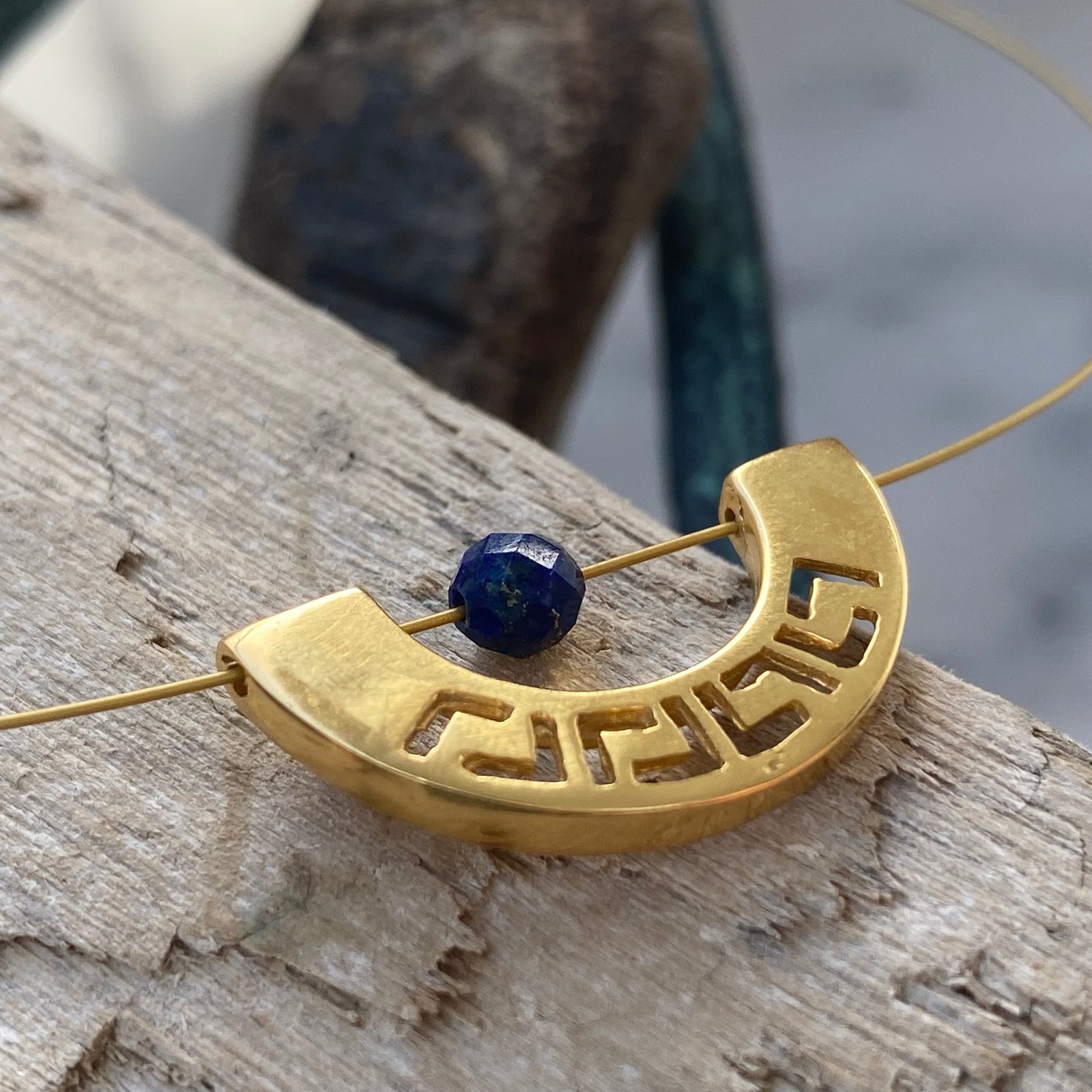 greek key choker necklace gold with a blue lapis