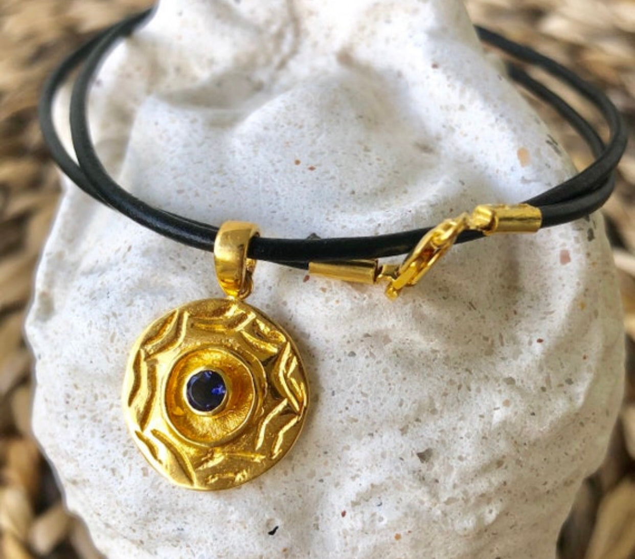 $89.00 USDgold evil eye necklace with iolite gemstone