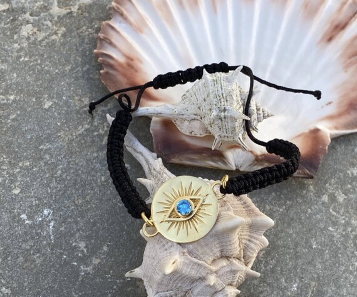 This is an evil eye bracelet gold with a blue gem, macrame Black nylon made in Greece
